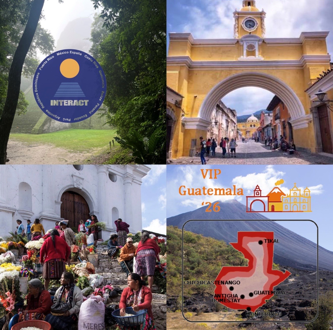 SIGN UP BY DECEMBER 15: -Submit a $250 deposit (check issued to Interact Travel), enrollment form, and waiver&release to: VIP Say Guate'2026, 2207 Velp Avenue, Green Bay, WI 54303. Forms: Adult Enrollment Form -Interact will advise when your enrollment arrives with the date that your check will be deposited (if your application is accepted). -Optional Travel Protection is strongly encouraged. Travel Insured provides options here. Additional Deadlines (payable by check or online with credit card): January 15: An additional $250 is due February 15: An additional $500 is due March 15: Passport copy is due + an additional $500 is due April 15: An additional $500 is due May 15: Submit you final balance of payment due (apx. $500) Program inclusions: Shared accommodations with your travel companion, touring & meals as shown on the Program Inclusions Outline, roundtrip air Chicago-Guatemala City, staff assistance throughout the land program, 24/7 Interact USA team support, all taxes for land providers as of November 17, 2025, tips to drivers and guides. Not Included: Cancel for any Reason and other types of travel protection, which can be purchased here or through the provider of your choice, meals, accommodations, touring, and transportation that are not listed on the program outline. Q&A: Is there a hotel option? No. All participants on the 2026 tour will stay with homestay families. Antigua is the perfect setting to stay with a homestay family, and we will do our best to confirm a home that has more of a B&B feel, if this is your preference. This type of arrangement is very common in Antigua, and homes in Antigua may host more participants than just you and your companion. Is the VIP tour for students? No; it is offered to Spanish teachers and their travel companion. If you have travelled with Interact, or are in process of enrolling for one of our programs you are invited to apply. Can I bring family or a companion that is not a Spanish teacher? Yes, you are allowed to bring one companion, and ages 18 and over are allowed. Additional companions must be pre-approved. Will I get to meet the equipo Interact? Yes; at least one member of the Interact team will accompany the group. What if I've recently retired or participated on other Interact VIP Tours? Welcome back! There are no restrictions on how many teacher tours you do. Priority is given to active Spanish teachers. What if I can't go this year? Interact offers VIP Teacher Tours annually. I have questions... Email interact@interact-travel.com | |